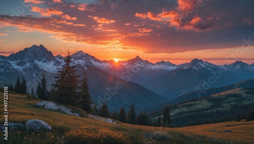 Sunset over mountain range with trees and grassy fields, creating a serene and picturesque landscape.