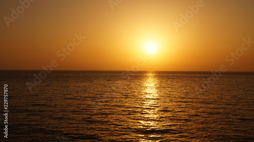 Sunset over Pacific Carribean beach showing dramatic red and yellow sky as sun sets