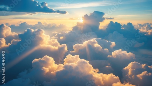 Sunset over the clouds from above with sunlight rays and a bright sky. Nature and sky scene. The tranquility and beauty of the atmosphere.