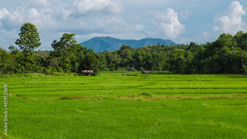 sunset over the green rice fields of central Thailand, green rice paddy field during rain season