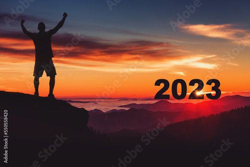 Sunset over the mountain hills and upcoming new year. Man tourist watching the sunrise. Lifestyle and travel concept.