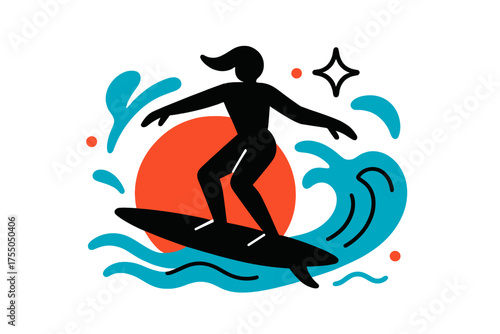 Sunset Surf Silhouette. Sunset Surf. A glowing surfer silhouette against setting sun, abstract floating spark and wave shapes symbolizing freedom. Modern