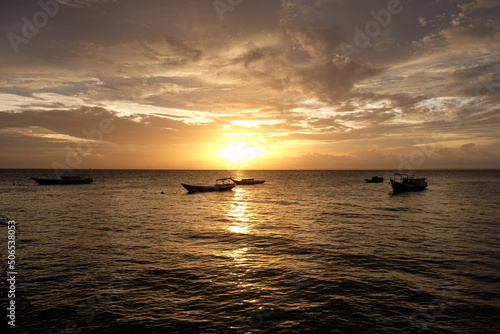 Sunset view with silhouette of fishing boats in the ocean. Warm colored sky with beautiful clouds.