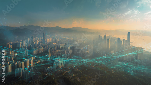 Sunshinea city of modern business and smart digital innovation with a network of interconnected rewards over the cityscape of the future smart wireless digital city and social media network