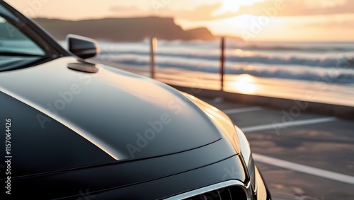 Super Close-Up of Black Car Reflecting Sunrise by the Sea