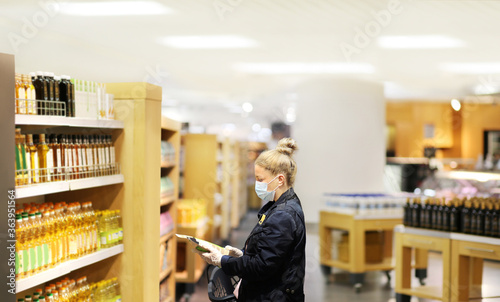 Supermarket shopping, face mask and gloves,Woman choosing a dairy products at supermarket