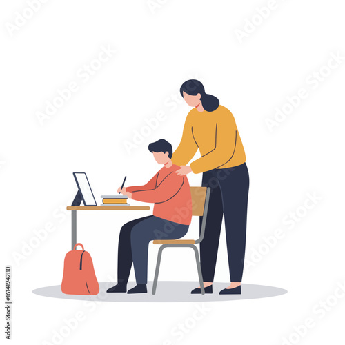 Supportive woman assisting young boy while studying at a desk with a laptop and books in a minimalistic indoor setting, educational concept of tutoring or coaching