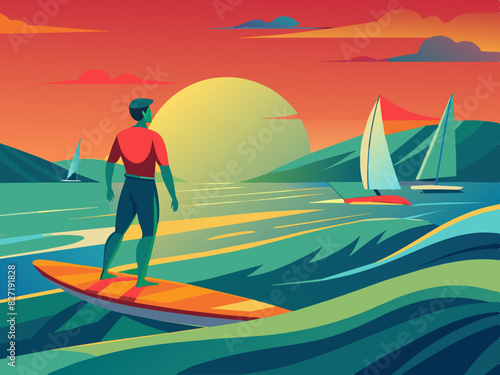 Surfer standing on board at sunset, calm ocean and sailboats. Dusk surfing scene, lone surfer with vibrant sunset backdrop. Evening surf session with serene ocean and distant boats.