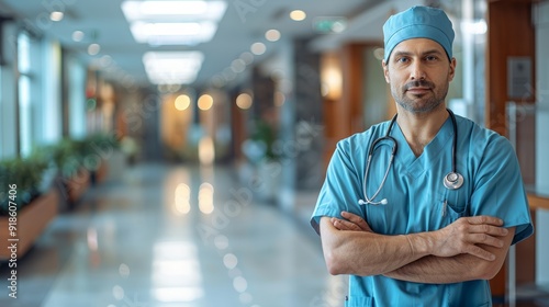 Surgeon standing confidently in a brightly lit hospital corridor during daytime