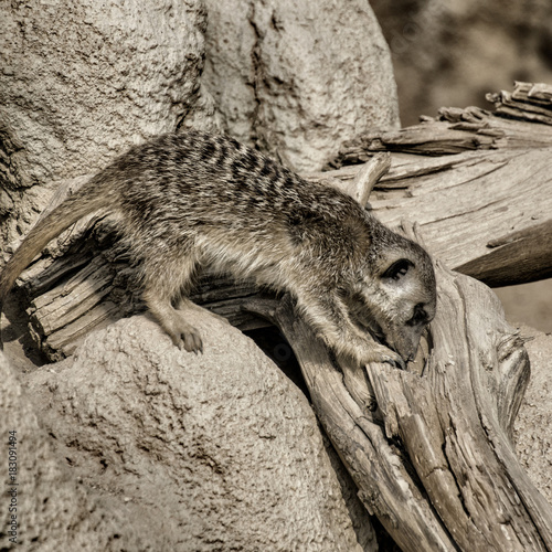 Suricato sbircia dentro a un tronco