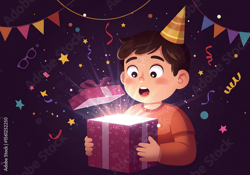 Surprised Boy Opening Gift Box with Glowing Light and Confetti.