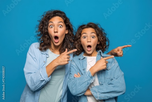 Surprised Hispanic mother and daughter in casual attire pointing ahead against a blue background