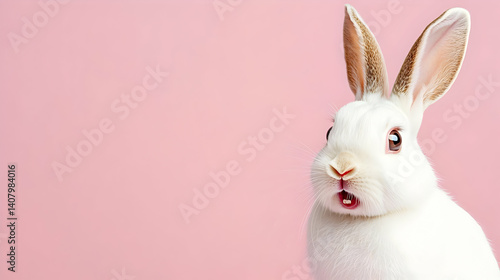 Surprised White Rabbit with Mouth Open Against Pastel Pink Backdrop Studio Portrait