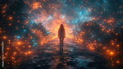 Surreal art of creative way inspiration motivation imagination, choice and dream concept idea, A woman with doors of light in fantasy garden. 3d illustration. mystery in nature landscape