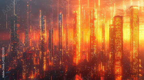 Surreal Digital Transformation of Cityscape with Glowing Skyscrapers and Morphing Golden Coins