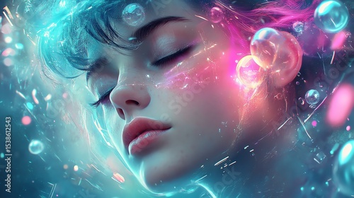 Surreal hyperrealism: A melancholic woman with closed eyes, glossy tears, and vibrant prismatic light reflections, set against an ethereal, neon-rainbow glow with psychedelic distortions.