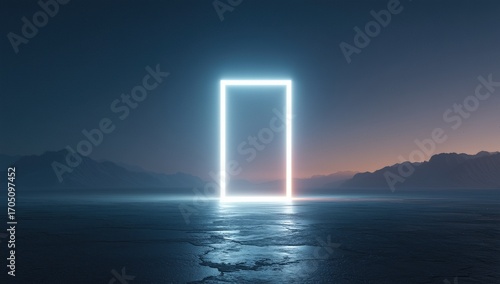 Surreal luminous frame illuminates rugged landscape, merging technology with nature in mysterious, cinematic scenery.