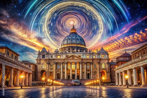 Surreal Night View: Roman Basilica, Starry Sky, Celestial Glow