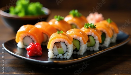Sushi platter, various rolls, elegant presentation, rolls, white
