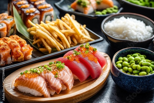 Sushi platter with sashimi, fried chips, and rice; restaurant setting
