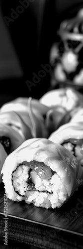 Sushi rolls served on a wooden plate in a cozy restaurant