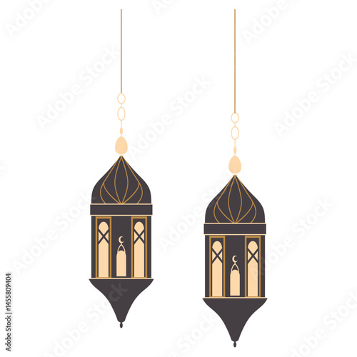 suspended golden lanterns with intricate patterns, varying in size, reflecting traditional Islamic art and decorative elegance.