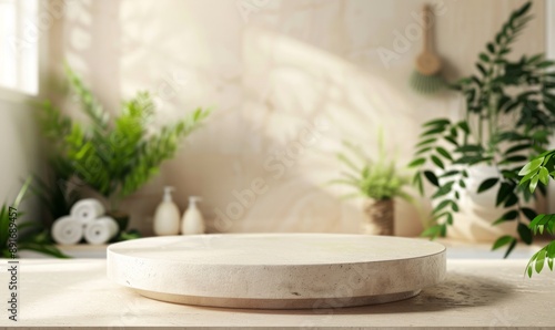 Sustainable Bathroom Scene with Blurred Interior on Travertine Circular Podium. Spa and Beauty Product Display Stage for Cosmetics Promotion. Eco-friendly 4K Wallpaper with Plants and Towels. AI-Gener