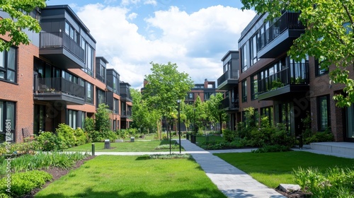 Sustainable living action in energy efficient residential neighborhood urban green space architecture daylight eco-friendly design