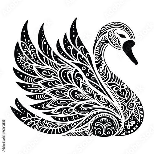 Swan bird in zentangle art, stencil logo, black and white animal illustration