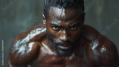 Sweaty Muscular Man Intense Gaze Powerful Physique