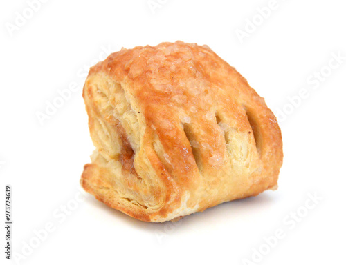 Sweet braided puff pastry isolated or pate feuilletee on white background top view. Fresh phyllo pastry with jam inside close up - Image