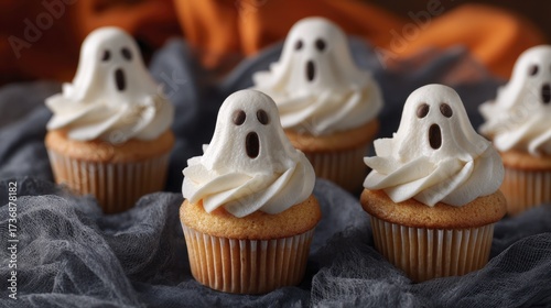 Sweet Halloween ghost cupcakes with creamy frosting on dark textured fabric