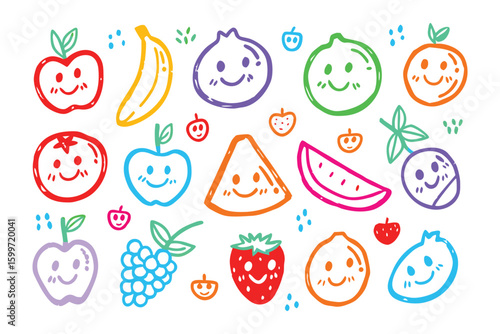 Sweet Smiles of Fruits: A delightful collection of hand-drawn fruits, each boasting a cheerful, friendly smile and vibrant colors, perfect for cheerful design projects