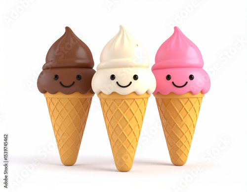 Sweet Trio: Delighting in the simple pleasures, these three adorable ice cream cones with smiling faces invite you to a world of joy and deliciousness.