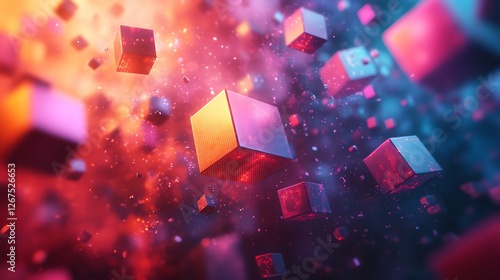 Symbolic representation of innovative thinking through block elements, 3D shapes, dynamic movement, vibrant gradients, modern technology motifs, and abstract design language