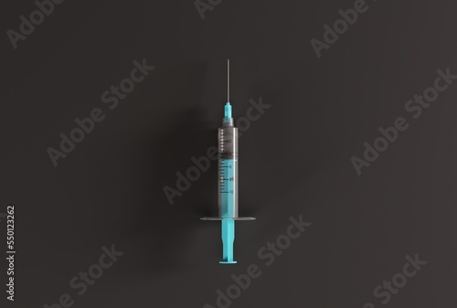 Syringe for making injections on a dark background. Concept of making injections, intravenously or intramuscularly administering drugs. Health and medical care concept. 3D render, 3D illustration.