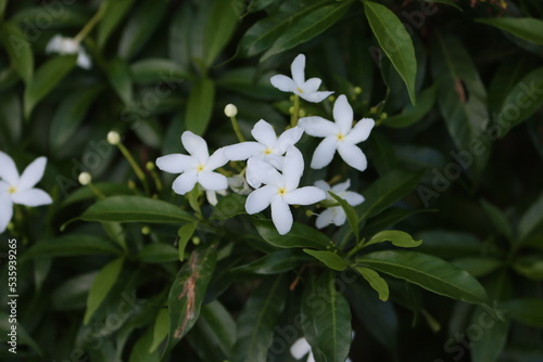 Tabernaemontana divaricata, commonly called pinwheel flower, crape jasmine, East India rosebay, and Nero's crown, is an evergreen shrub or small tree native to South Asia, Southeast Asia.