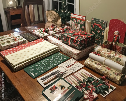 Table Prepared with Christmas Wrapping Supplies