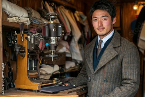 Tailor working with sewing machine in a cozy workshop during the afternoon in a scenic location