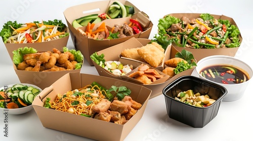 Take away food in plastic boxes on white background. Take away food concept
