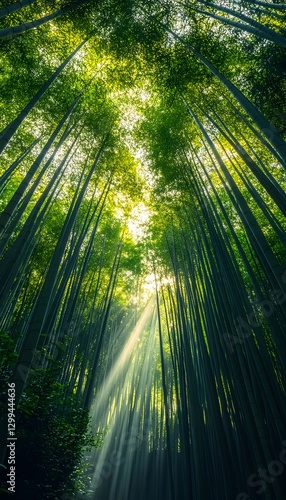 Tall bamboo trees reaching towards the bright sunlight above their canopy