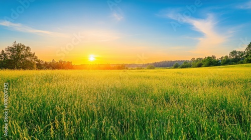 Tall flowering grass on green meadow at sunrise or sunset