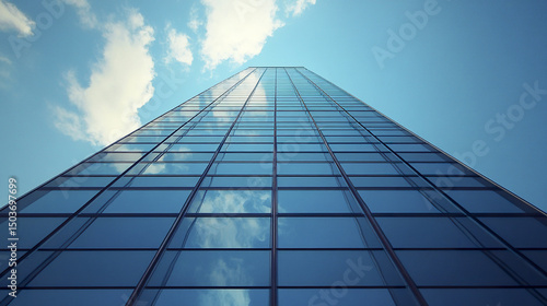 tall glass building reflecting sky and clouds, showcasing modern architecture