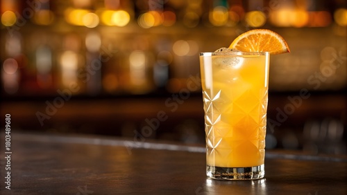 Tall Glass Cocktail with Orange Slice and Ice on a Bar Counter with Blurred Background