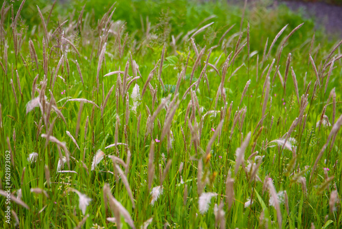 Tall wild grass with fluffy seed heads swaying in a green field.