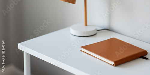 Tan Leather Notebook and White Desk Lamp on White Side Table