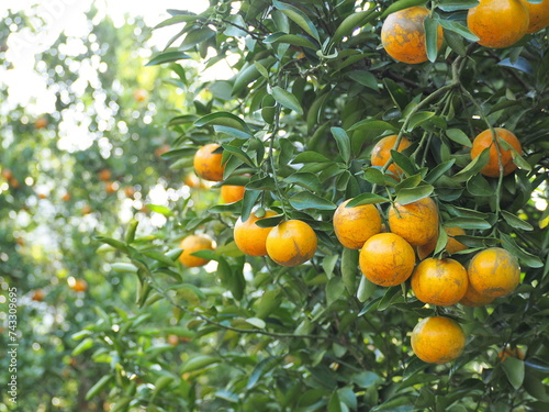 Tangerine orange farm full of ripe orange fruits. Ripe oranges hanging on branch at organic orange farm. Type of orange has thin peel, lots of seeds, and high in vitamin C. Blur background and bokeh
