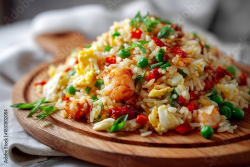 tasty fried rice on a wooden board while standing against minimalist or empty room background