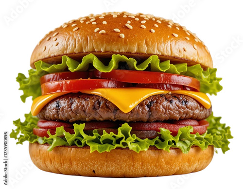 Tasty Hamburger with Cheese, Beef, Lattos, Onion, and Tomato Isolated on Transparent PNG Background.