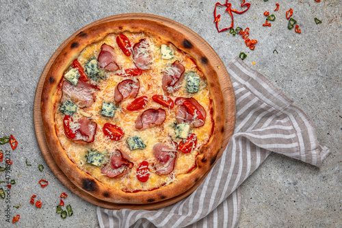 Tasty hot italian pizza with Mozzarella, Doblu, hunting sausages, pepper and Tomato Sauce on a beige textured background. Pizzeria menu.